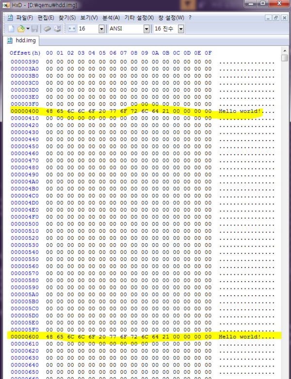 예상대로 섹터 2와 섹터 3의 첫 줄에 Hello world! 가 저장되어 있는 것을 확인할 수 있습니다. 이렇게 간단하게 하드디스크에 쓰는 함수를 구현했습니다!! 드디어 HoGoS 에서도 자료를 하드디스크에 저장할 수 있게 된 겁니다.