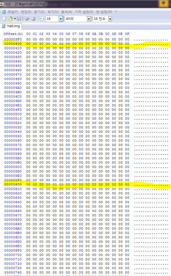 좋습니다! 이제 바로 컴파일해보고 Qemu로 돌려봅시다. 그 전에 하드디스크에 해당하는 hdd.img의 섹터 2, 섹터 3을 먼저 체크해봅시다.