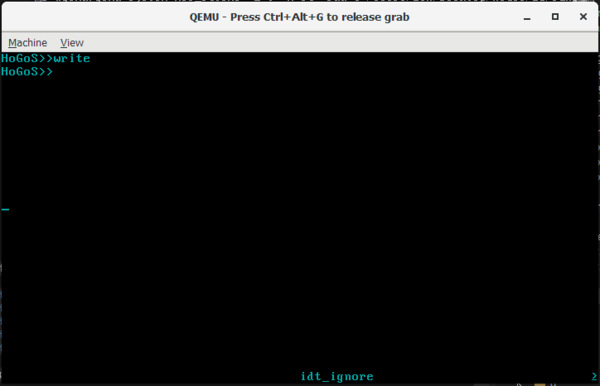 보다시피 아무것도 없습니다. 이제 Qemu 상에 write 명령을 입력합시다. 하드디스크를 읽었을 때와 마찬가지로 쓸 때도 인터럽트가 발생합니다. 따라서 idt_ignore 가 아래에 찍혀나옵니다. 그리고 아무것도 출력하지 않게 해놓았으니 아무 반응 없을 겁니다.