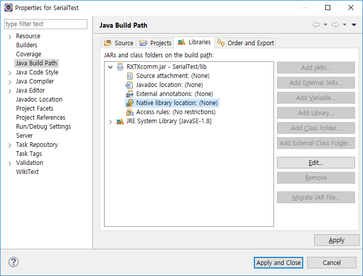 Native library Location을 선택해준다. 그리고 Edit을 누른다.