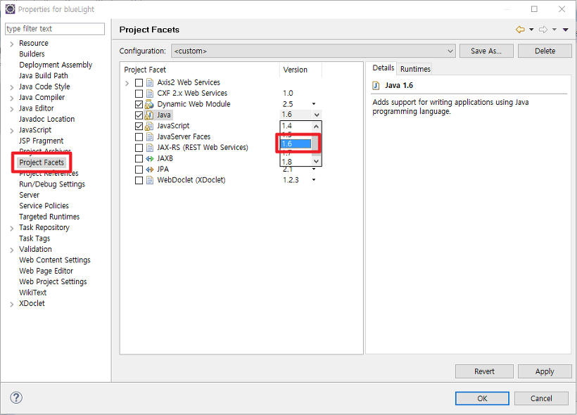 좌측 Project Facets 에 들어가주세요.