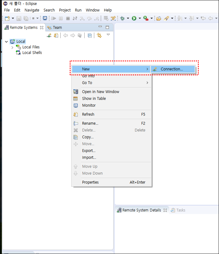 ▼그럼 해당과 같은 모습이 보일텐데 여기서 마우스 오른쪽 버튼을 누르고 new-> connection을 눌러 봅시다.