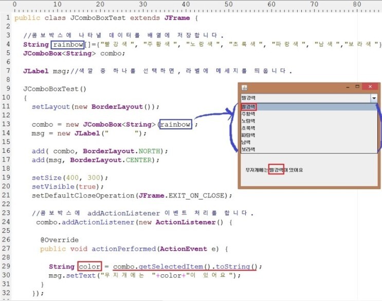 JLabel msg;//색깔 중 하나를 선택하면, 라벨에 메세지를 띄웁니다.
