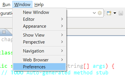 Eclipse(이클립스)를 실행하여 메뉴바의 [Window]-[Preferences]를 클릭합니다.