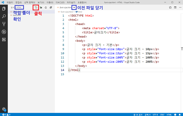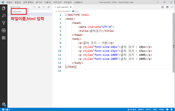 지난 시간에는 인라인 방식으로 글자 크기(font size)를 정해 보았습니다.