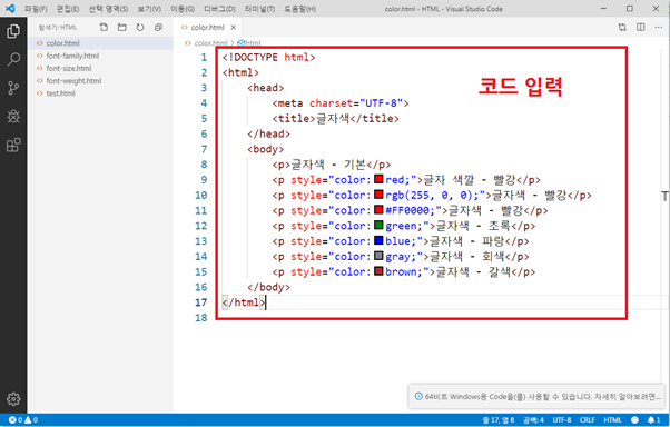 같은 방식으로 오늘은 글자색(color)을 지정해 보도록 하겠습니다.