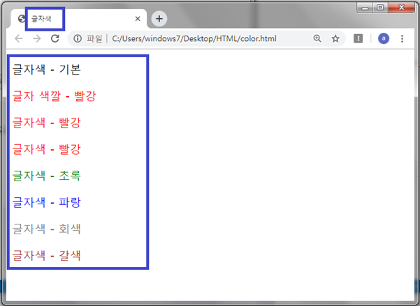 ⑦ 웹 브라우저에서 html 문서의 타이틀과 본문의 글자색을 확인합니다.