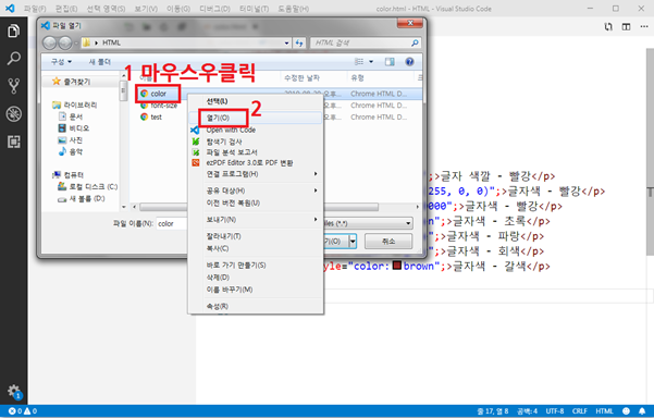 파일 열기 창에서 저장한 파일 color.html에 마우스를 놓고 오른쪽 버튼을 클릭한 후, [열기]를 선택하세요.