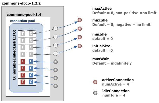 - 이후 비즈니스 로직이 커넥션을 사용한 후 pool에 반납할 경우, maxIdle = 5에 영향을 받아 커넥션을 실제로 닫아버리므로 일부 커넥션을 매번 생성했다 닫는 비용이 발생할 수 있다.