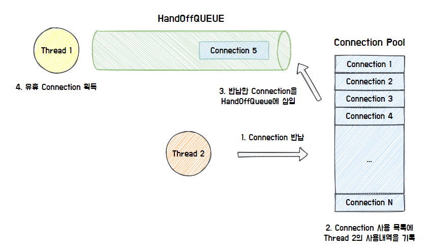 - 최종적으로 사용한 Connection을 반납하면 Connection Pool이 Connection 사용 내역을 기록하고, HandOffQueue에 반납된 Connection을 삽입한다.