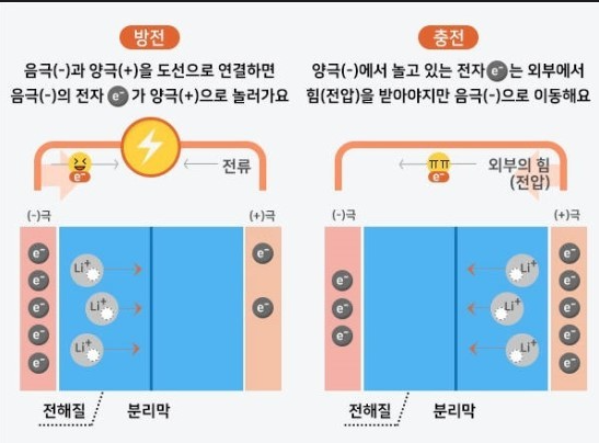 전자를 잃은 음극에서는 리튬이온(+)이 분리되어 양극(+)으로 이동하죠.