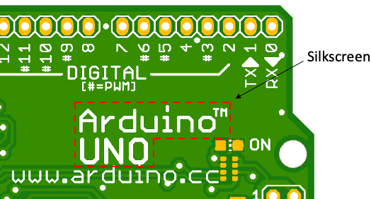 실크스크린은 솔더마스크를 바른 후 추가적으로 바르는 흰색 물질입니다. 첫 번째 사진처럼 로고를 보여주기도 하고 두 번째 사진처럼 부품의 이름, 위치, 종류, 방향 등을 표시하기도 합니다.