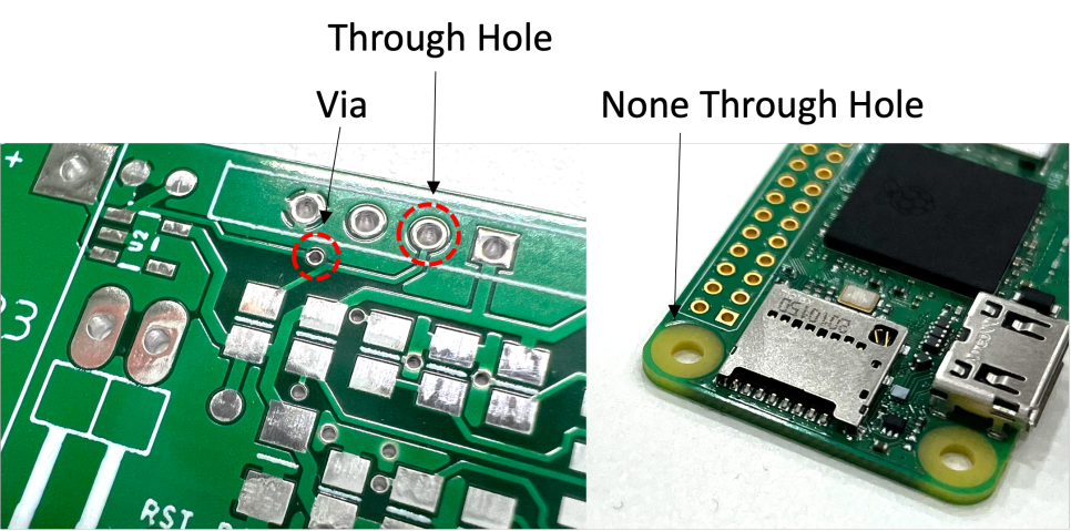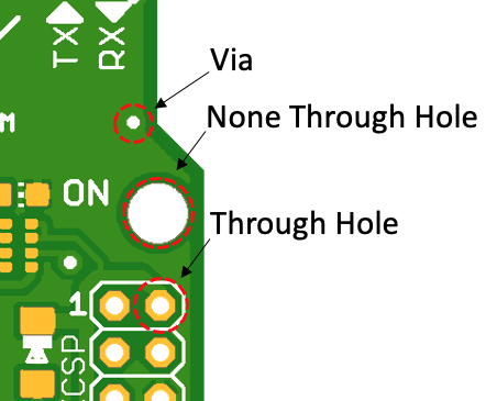 다음은 PCB에 있는 구멍들입니다. 구멍의 형태에 따라 크게 스루홀(Through Hole)과 논스루홀(None-Through Hole)로 구분합니다. 주로 DIP 부품을 연결하거나 서로 다른 두 레이어를 연결할 때 스루홀을 사용하며, 결합을 위한 구멍으로 논스루홀을 사용합니다.