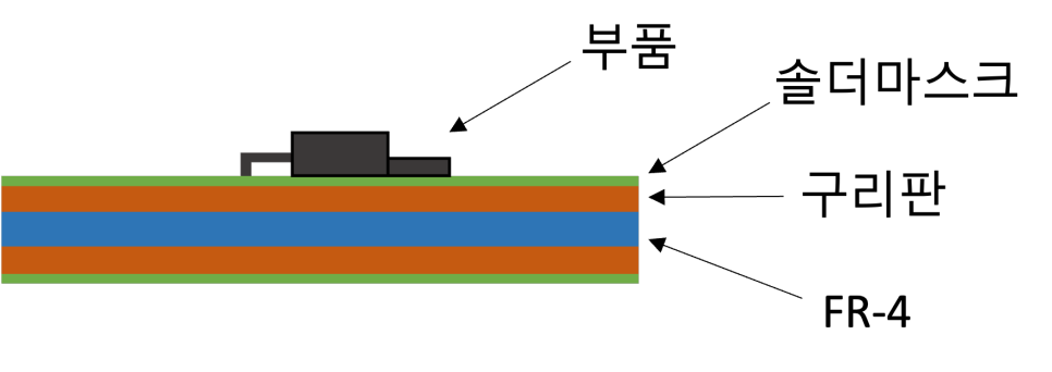 2개의 층을 가지는 FR-4 기판은 위와 같은 단면 구조를 가집니다. 가공되기 전의 기판은 FR-4 양옆에 구리판이 부착되어 있는 형태이지만, 가공을 진행하며 구리판을 회로에 맞게 자르고 구리판을 보호하는 막을 씌워 위와 같은 구조를 가지게 됩니다.