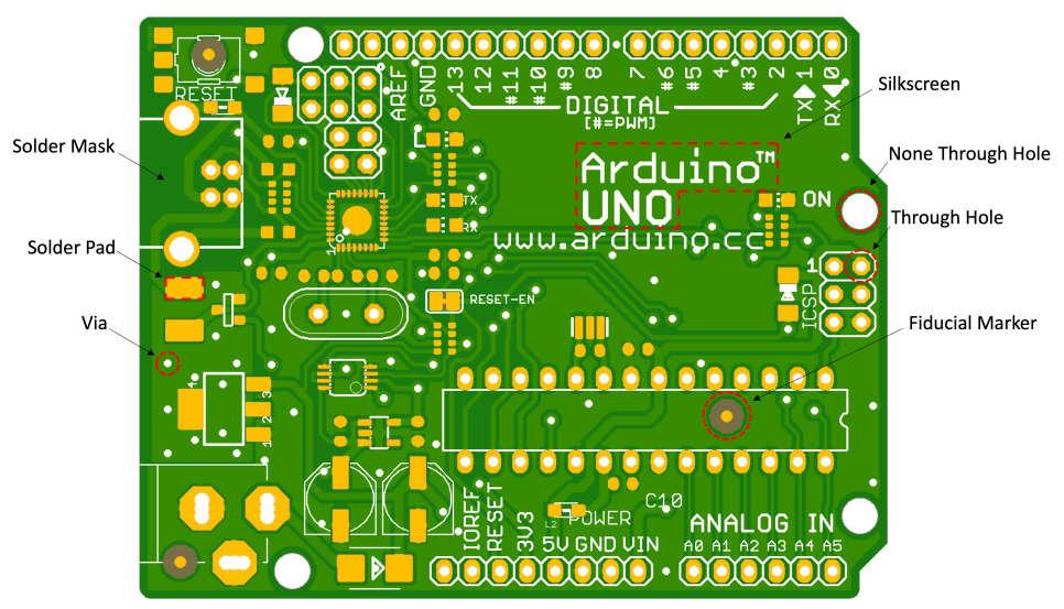 구리판에 솔더마스크를 바르는 모양, 양쪽의 구리판을 연결하는 방법 등에 따라 위와 같은 구성 요소를 가집니다. 하나씩 살펴봅시다.