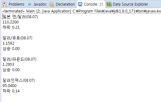 예제로 네이버 금융 사이트에서 국제시장환율 란의 환율 데이터를 긁어와서 화면에 출력해 보겠습니다.