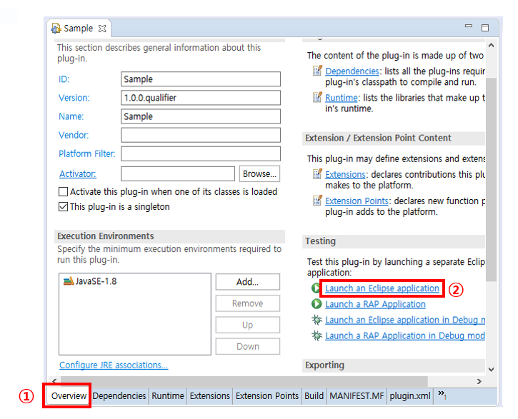 (7) Overview를 선택하고 Launch an Eclipse application을 클릭하여 이클립스를 실행한다.