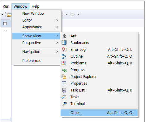 (8) Window >Show View> Other... 을 클릭한 후, Sample View를 선택한다.