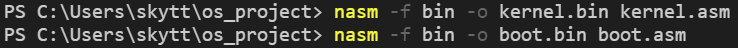 copy 명령어를 이용해 두 파일을 합쳐 하나의 .img 파일을 만들겠습니다. 이상하게도, vs code의 파워 쉘( power shell )에서 명령어가 제대로 작동하지 않는 문제가 있습니다. windows의 cmd창을 열어서 copy 명령어를 다음과 같이 사용해주세요.