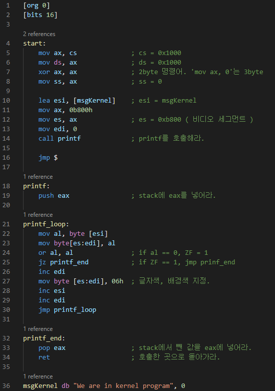 아직 커널이라고 하기에는 많이 부족한 프로그램이지만, 커널을 만들어봅시다. kernel.asm 파일로 작성해주세요.