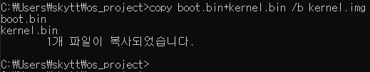 copy 명령어를 이용해 두 파일을 합쳐 하나의 .img 파일을 만들겠습니다. 이상하게도, vs code의 파워 쉘( power shell )에서 명령어가 제대로 작동하지 않는 문제가 있습니다. windows의 cmd창을 열어서 copy 명령어를 다음과 같이 사용해주세요.