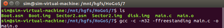 먼저 첫 번째 명령어입니다. " gcc -c -m32 -ffreestanding main.c -o main.o "