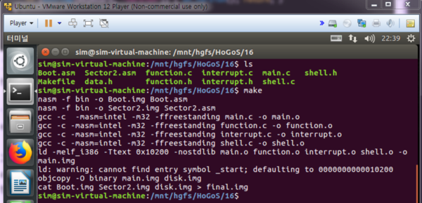 " HoGoS>> " 이후에 명령어를 입력한다. while(1) 이 돌아가면서 주기적으로 >> 이후에 keyboard에 적혀있는 버퍼값을 써준다 ( 이는 사용자가 키보드를 두들긴 값들이 차곡차곡 적혀있다. )