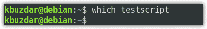 We will be creating the script named “testscript” using the Nano editor; however, you can choose any editor of your choice. Before creating a script file, make sure its name does not conflict with the commands. You can check this by typing “which” followed by the script name:
