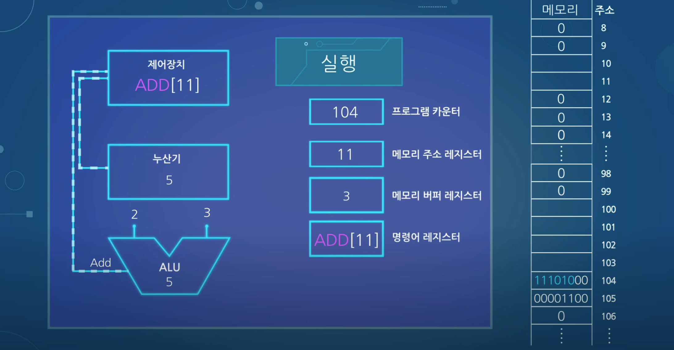- 제어장치 : 명령어 레지스터에게 명령을 받아 해석하고 시스템에 지시를 보냄