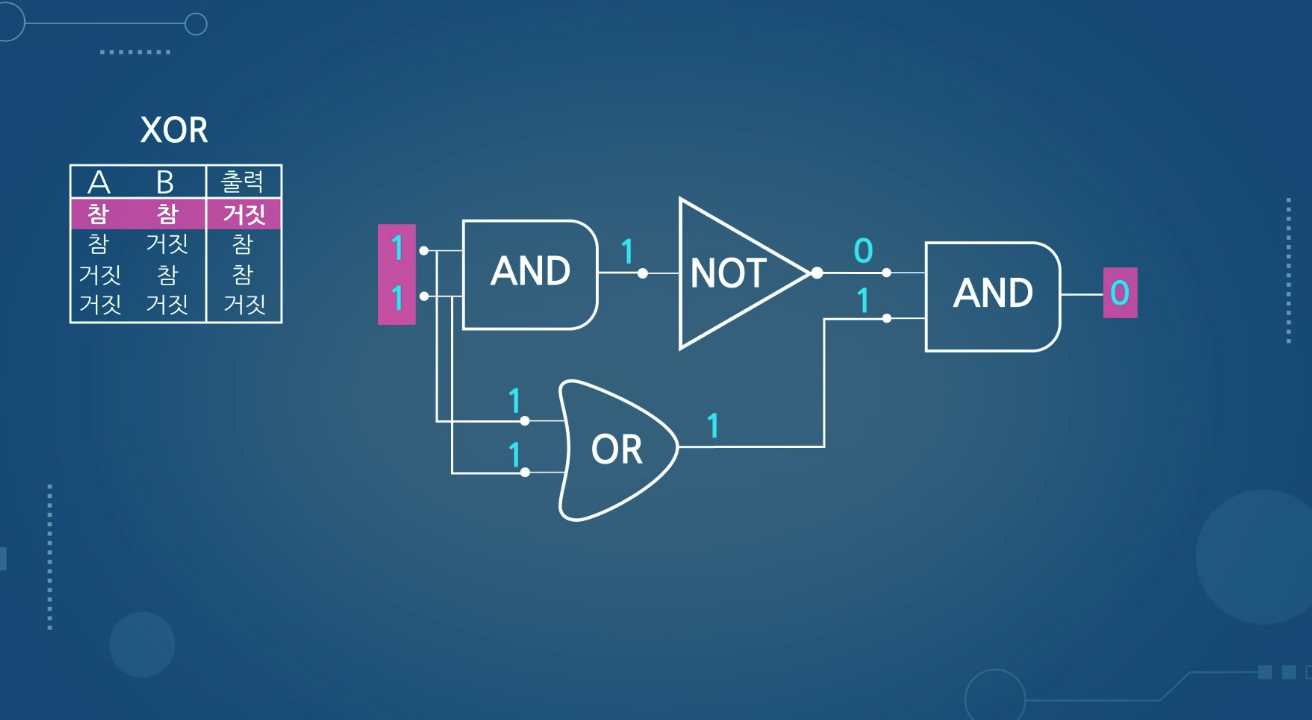위에서 나온 게이트들을 조합하여 XOR 게이트 구성 가능