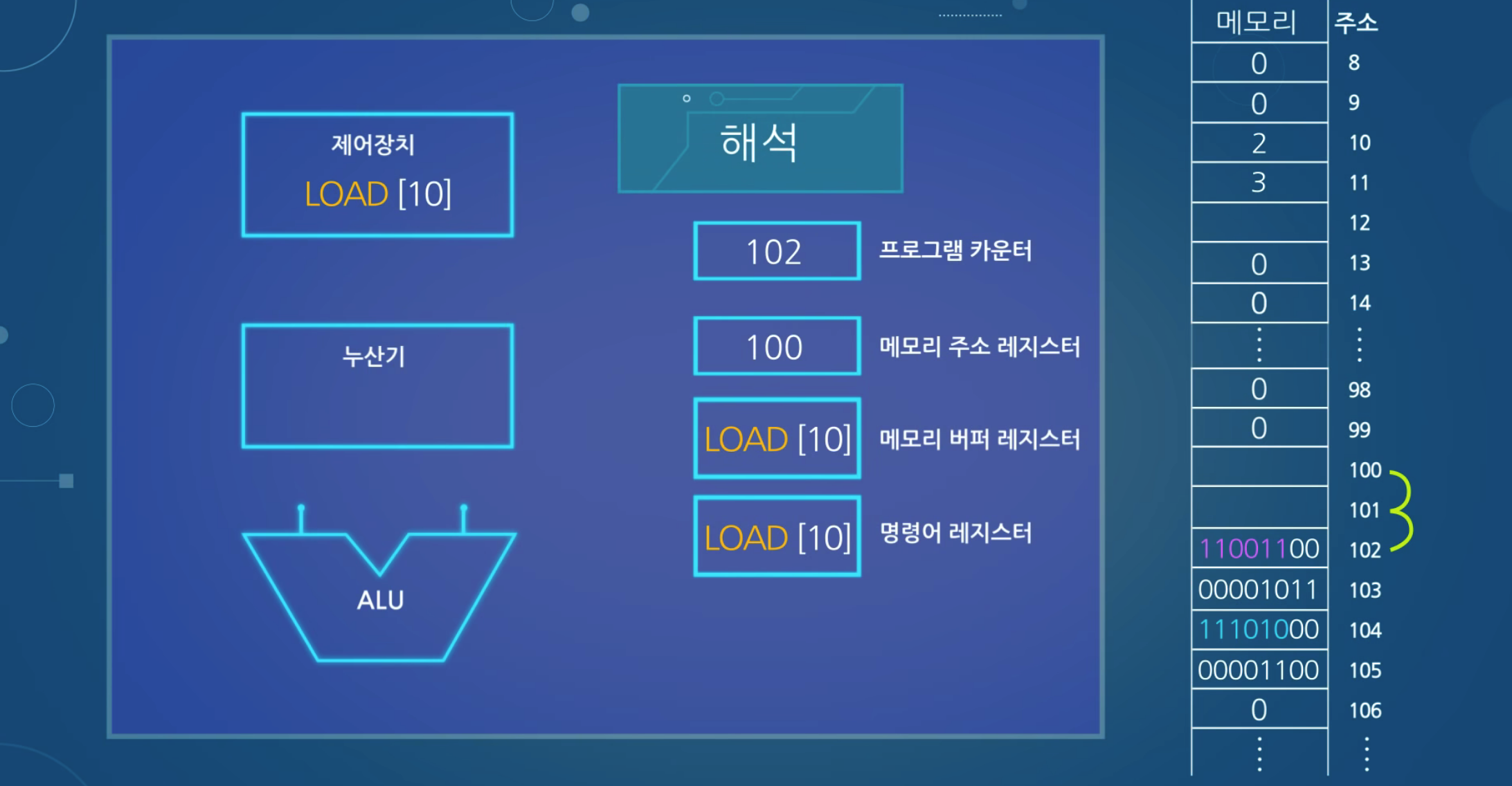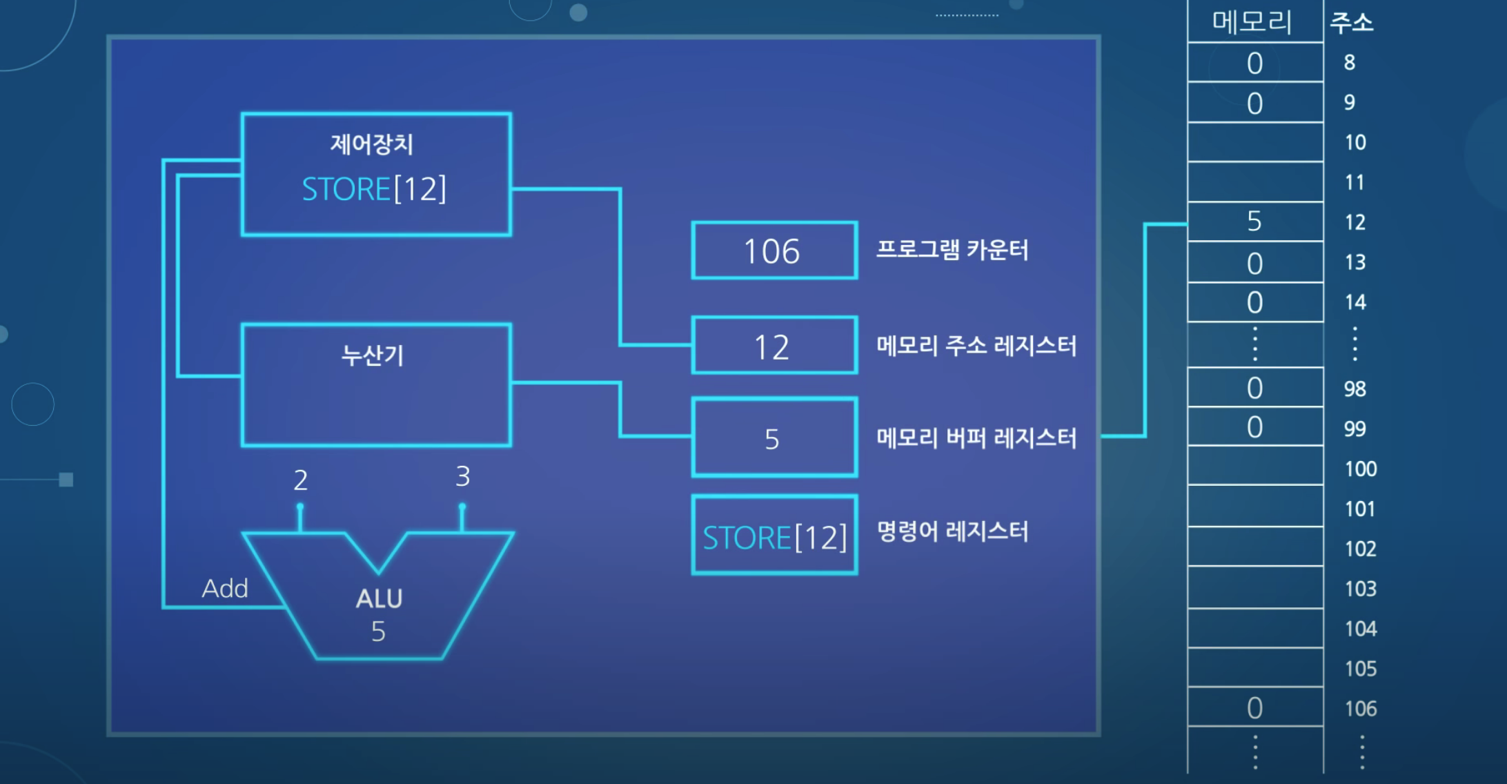 - 제어장치 : 명령어 레지스터에게 명령을 받아 해석하고 시스템에 지시를 보냄