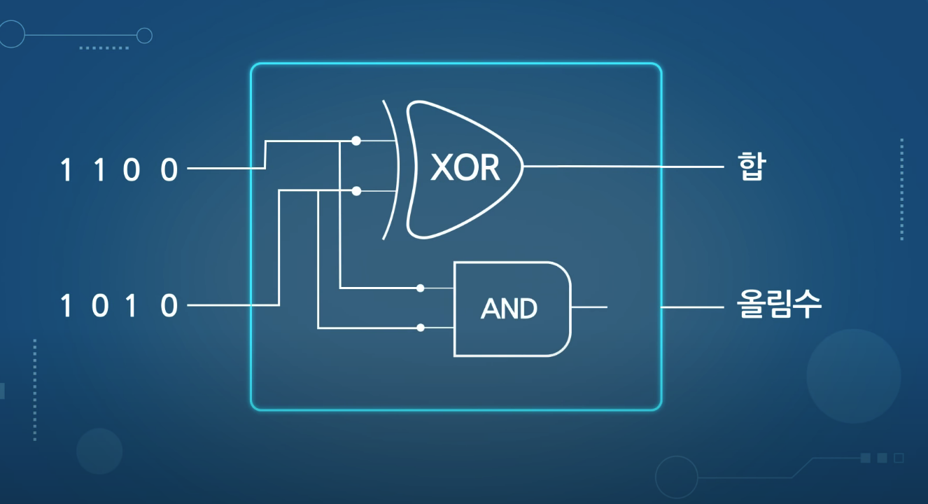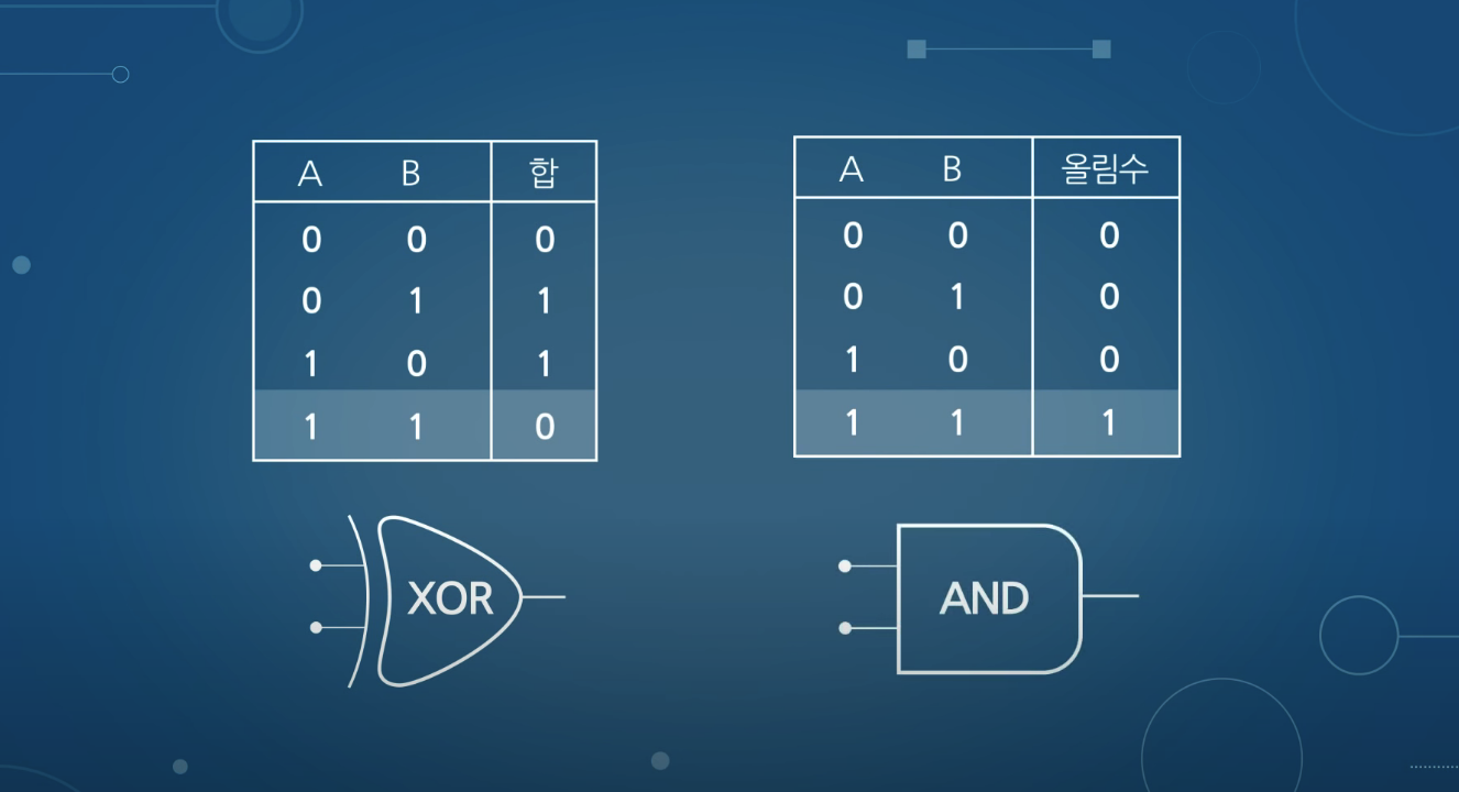 합과 올림수는 각 XOR, AND 게이트의 논리와 동일하므로