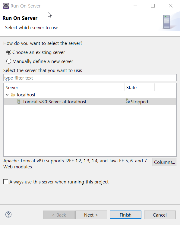 Run On Server 창에서 좀 전에 셋팅한 서버를 선택을 하고 Finish 를 누른다.