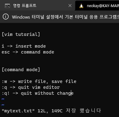 텍스트를 편집하기 위해서는 i (insert) 키를 누르고 편집을 시작합니다. 편집모드(insert mode)에서 다시 명령모드로 돌아오려면 ESC 키를 누릅니다. 편집된 내용을 저장하려면 명령모드에서 :w 를 입력합니다. 프로그램을 종료하는 것은 :q 인데 텍스트 내용에 변경이 있으면 그냥 종료가 되지 않습니다. 내용을 변경하지 않고 종료하는 방법은 :q! 입니다.