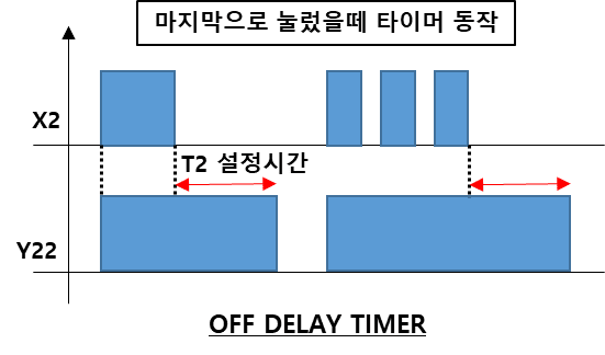 타이머가 동작하기 전까지 입력신호(X2)를 주기적으로 주게되면 OFF DELAY TIMER는 계속 초기화 됩니다.