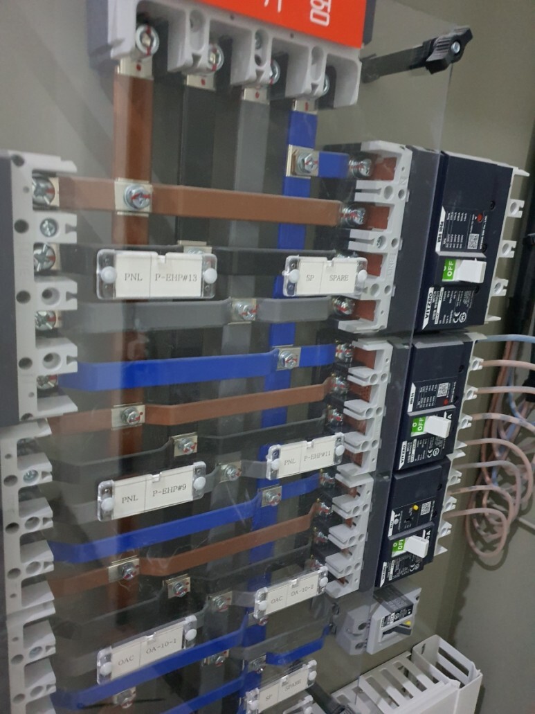 주 전원을 사용하는데 콘센트가 없기때문에 간이분전반을 쓰려고 트레이상에 연결된 주전원에서 차단기 차단기에서 분전반으로 잇는 것이다.