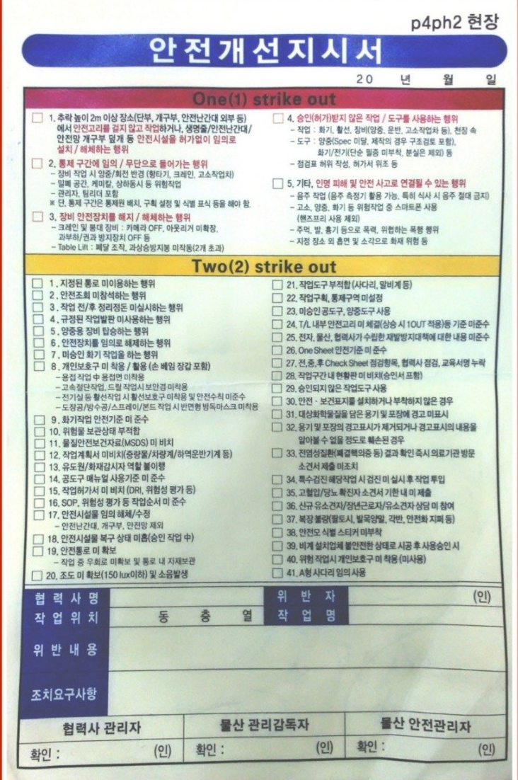 그러면... 그걸 사진으로 찍는다. 그리고... 각 업체 안전 관리자... (안전 감시단이 경찰 비스 무리한 거면... 안전 관리자는 변호사 비스무리한 거다. 은근히 이 구조가 웃기다. 지적이 많으면 업체 안전 관리자는 성과금 같은 걸, 잘 못 받고.... 위험성 대책에 대해서 글을 또 써야 되서.... 불합리 받는 걸 싫어한다고 들었다.)