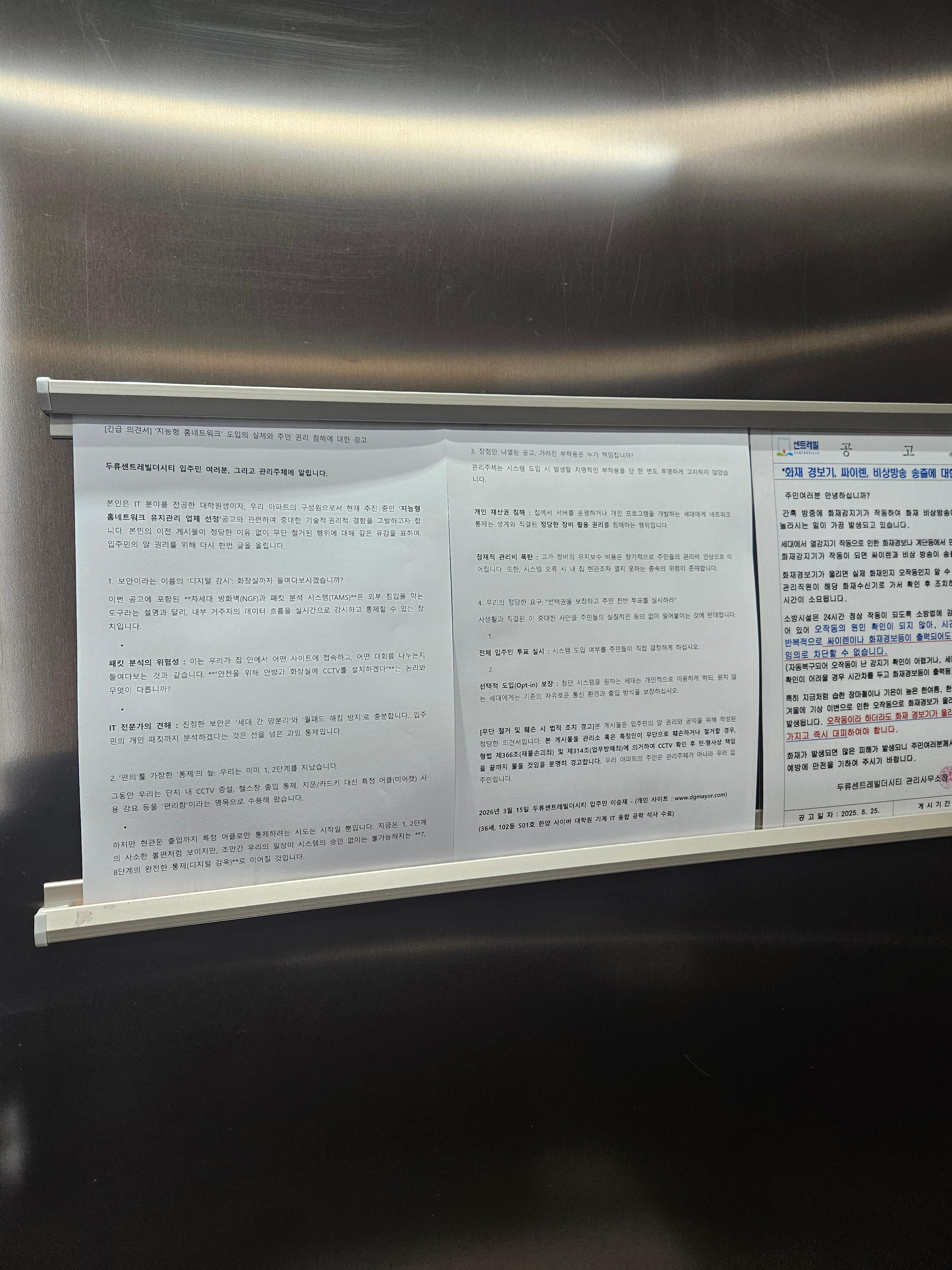 - 개인 데이터의 유출: TAMS(위험 분석 관리 시스템)와 NMS(네트워크 장비 상태 모니터링)까지 도입되면 입주민의 활동 패턴이 고스란히 데이터로 축적됩니다. 우리 집 안에서 어떤 사이트에 접속하고 어떤 대화를 나누는지 들여다보는 것과 다를 바 없습니다.