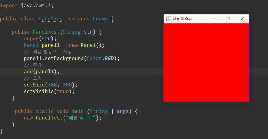 import java.awt.*;public class PanelTest extends Frame {public PanelTest(String str) {super(str);Panel panel1 = new Panel();// 색을 빨강으로 지정panel1.setBackground(Color.RED);// 추가add(panel1);// 크기setSize(300, 300);setVisible(true);}public static void main (String[] args) {new PanelTest("패널 테스트");}}