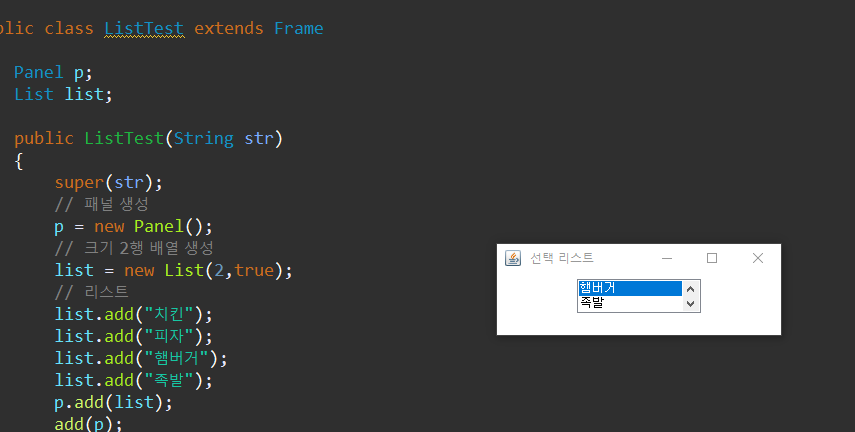package dfsfd;import java.awt.Frame;import java.awt.List;import java.awt.Panel;public class ListTest extends Frame{Panel p;List list;public ListTest(String str){super(str);// 패널 생성p = new Panel();// 크기 2행 배열 생성list = new List(2,true);// 리스트list.add("치킨");list.add("피자");list.add("햄버거");list.add("족발");p.add(list);add(p);setSize(300,100);setVisible(true);}public static void main(String args[]){// 리스트 생성자 호출new ListTest(" 선택 리스트");}}