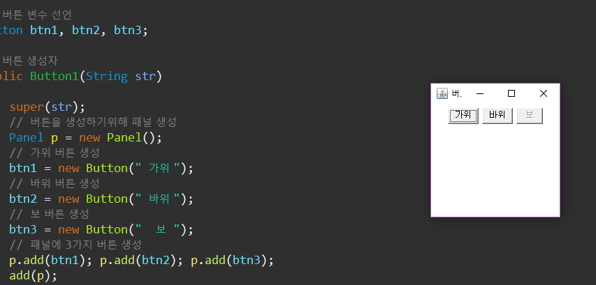 package dfsfd;import java.awt.Button;import java.awt.Frame;import java.awt.Panel;// class를 Button으로 만들게되면 Button 객체와 겹치게되므로// Button1로 만들어주는게 편하다.public class Button1 extends Frame{// 버튼 변수 선언Button btn1, btn2, btn3;// 버튼 생성자public Button1(String str){super(str);// 버튼을 생성하기위해 패널 생성Panel p = new Panel();// 가위 버튼 생성btn1 = new Button(" 가위 ");// 바위 버튼 생성btn2 = new Button(" 바위 ");// 보 버튼 생성btn3 = new Button("  보  ");// 패널에 3가지 버튼 생성 -> 이거 해야 화면에 보임p.add(btn1); p.add(btn2); p.add(btn3);add(p);btn3.setEnabled(false); //버튼 비활성화 여부 지정// 윈도우창 크기는 200 x 200setSize(200, 200);// 윈도우창 띄우기setVisible(true);}public static void main(String args[]){// 버튼 생성자new Button1("버튼 만들기");}}