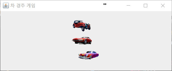 그리고 각각의 객체의 start메소드를 호출하면 쓰레드를 상속받은 MyThread클래스 내부의 오버라이딩한 run메소드가 자동으로 호출되고 메소드 내부에서는 for문으로 x위치값을 random값으로 뽑아서 그만큼 x값을 재설정해주는식으로 구현해서 자동차가 움직이게 보이도록 했다. 그리고 sleep메소드로 0.1초씩 딜레이를 준다. sleep메소드를 사용하기위해선 예외처리를 해줘야대서 예외처리까지 try ~ catch문으로 해주었다. 그리고 마지막으로 다시 CarGame클래스의 생성자로 돌아와서 setVisible메소드를 true값으로 실행시켜주면 잘동작하게된다.