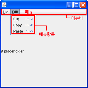 //menuItem = new JMenuItem(“메뉴항목1”, KeyEvent.VK_T); ->키보드 단축키 설정 가능