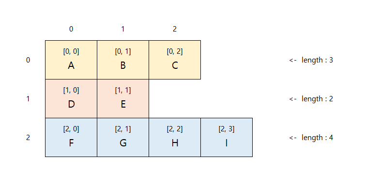 각각의 row가 3개, 2개, 4개의 원소를 가지는 2차원 배열입니다.