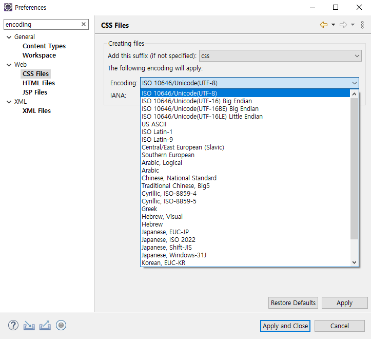 세 번째로 CSS Files, HTML Files, JSP Files, XML Files 를 각각 선택해서 UTF-8ISO 10646/Unicode(UTF-8) 로 변경합니다.