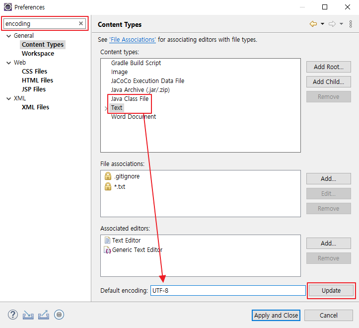 먼저 Content Types 를 선택해서 Java Class File과 Text를 각각 선택해서 하단의 Default encoding 입력란에 UTF-8을 입력하고 Update 버튼을 클릭합니다.