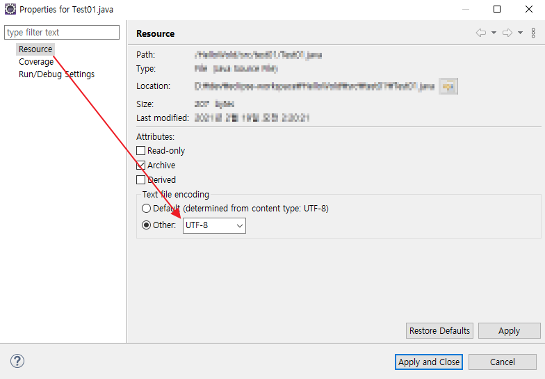 개별 파일도 프로젝트와 동일합니다. 인코딩 설정할 파일을 선택한 후 Alt + Enter 또는 마우스 우클릭 → Properties 을 클릭합니다. Resource를 선택해서 Other를 UTF-8로 변경하면 됩니다.