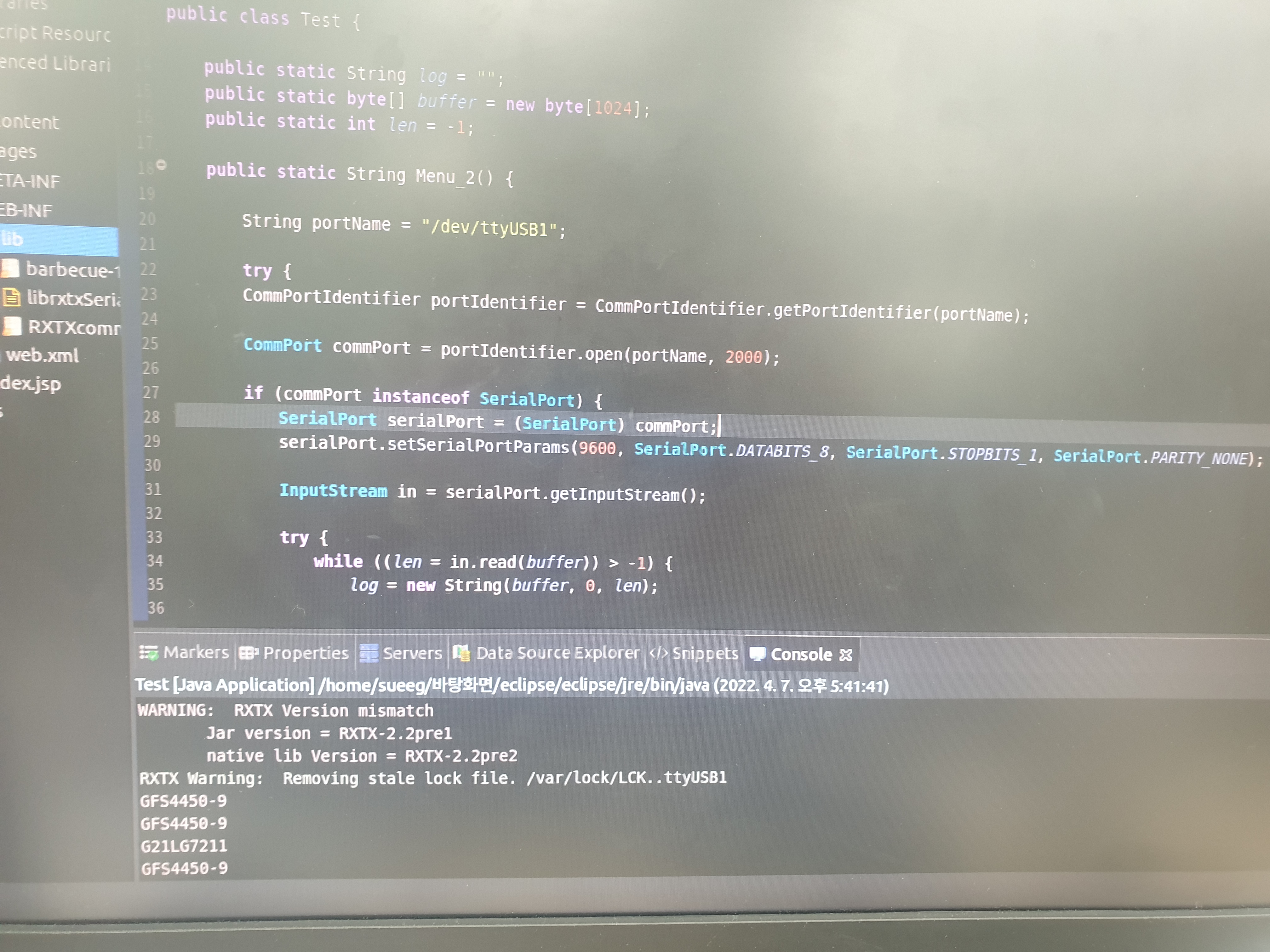 이후 이클립스에서 http://mfizz.com/oss/rxtx-for-java 에서 리눅스용 .dll 대신 .so 가 들어 있는 자바 전용 라이브러리를