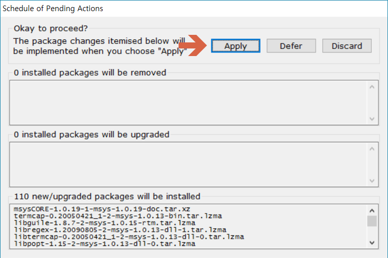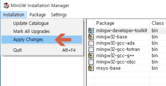 메뉴바의 [Installation] - [Mark All Upgrades]를 클릭하고 이어, [Apply Changes]를 클릭합니다.