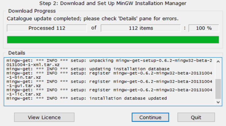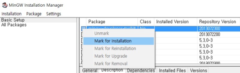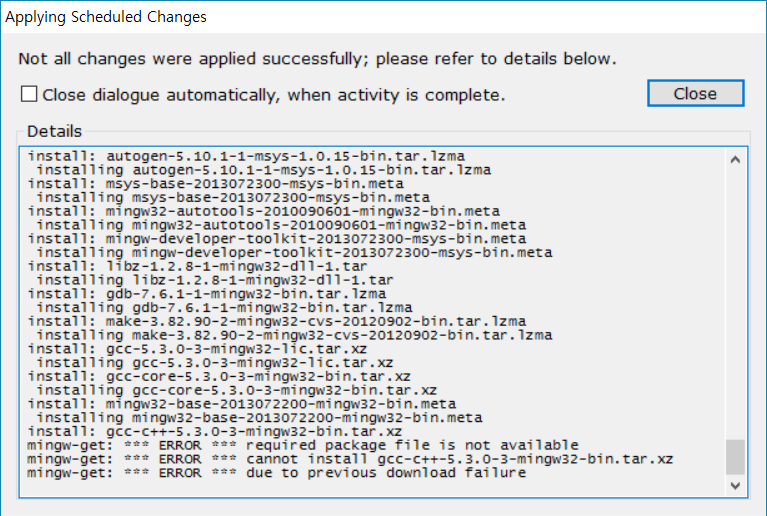 모든 설치가 끝나고 [Close] 버튼이 활성화 되면 클릭하여 MinGW 설치를 마칩니다.